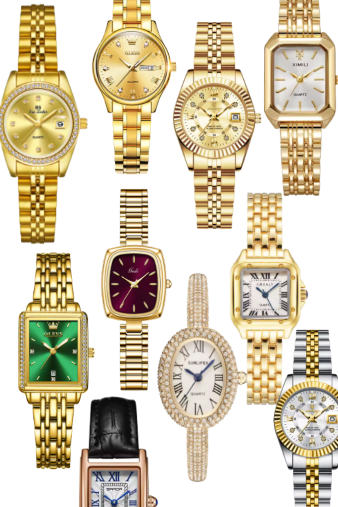 Most famously seen on Princess Diana, we have the Cartier Tank. Introduced in 1917 and inspired by the silhouette of WWI military vehicles, is arguably the most influential watch design ever made.It’s clean lines and timeless design give the watch that classy quiet luxury ‘old money’ feel. Princess Diana is also known for loving the Cartier Panthere, which is much more feminine in design, almost more of a bracelet than a watch. I’ve found the best Cartier inspired watches on Ali Express, so that you can try these silhouettes for yourself.